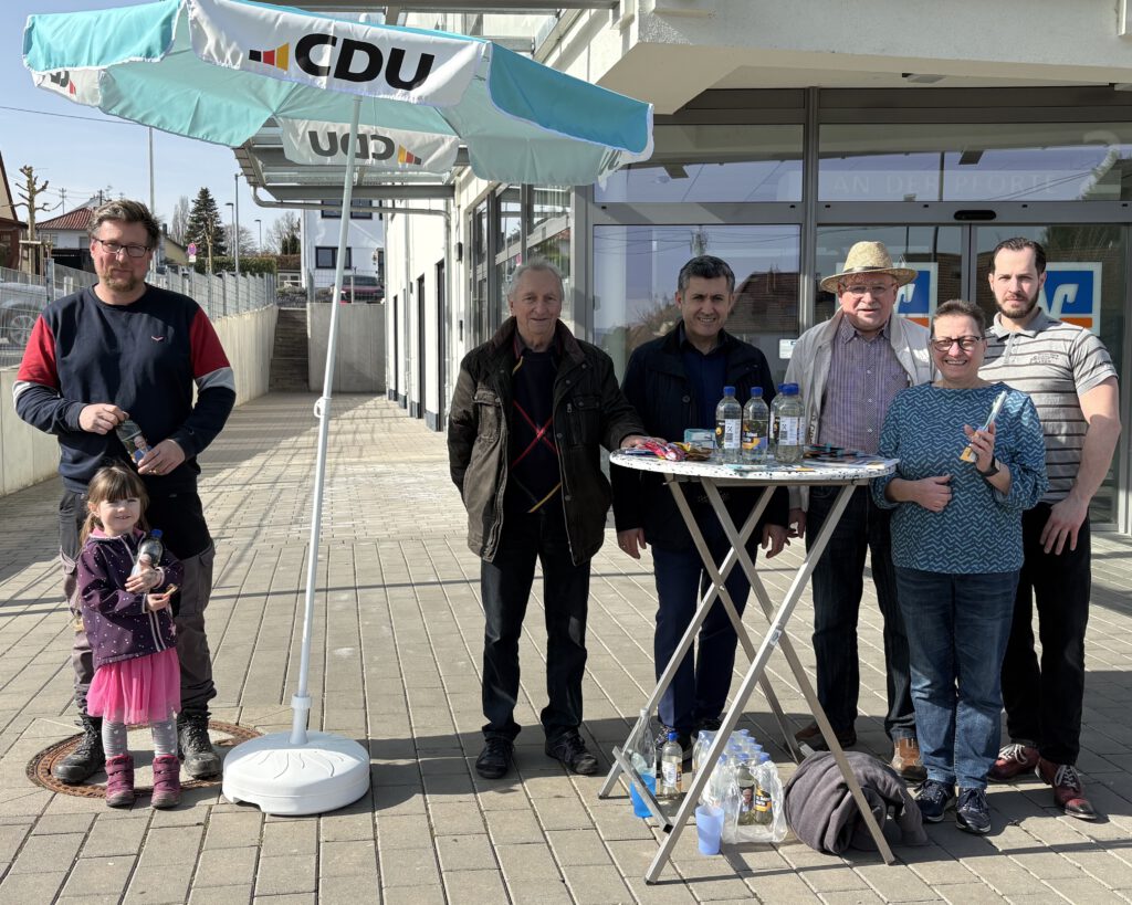 Noch am selben Vormittag baute die CDU Langenlonsheim einen Informationsstand an der Filiale der Volkbank neben dem Parkplatz des REWE-Marktes auf. So kam man bei strahlendem Sonnenschein mit zahlreichen Personen, die u. a. zum Einkaufen hierher gekommen waren, ins Gespräch. Zu weiteren Information wurden Flyer verteilt; auch die kleinen Give-aways fanden großen Anklang und wurden gerne mitgenommen.